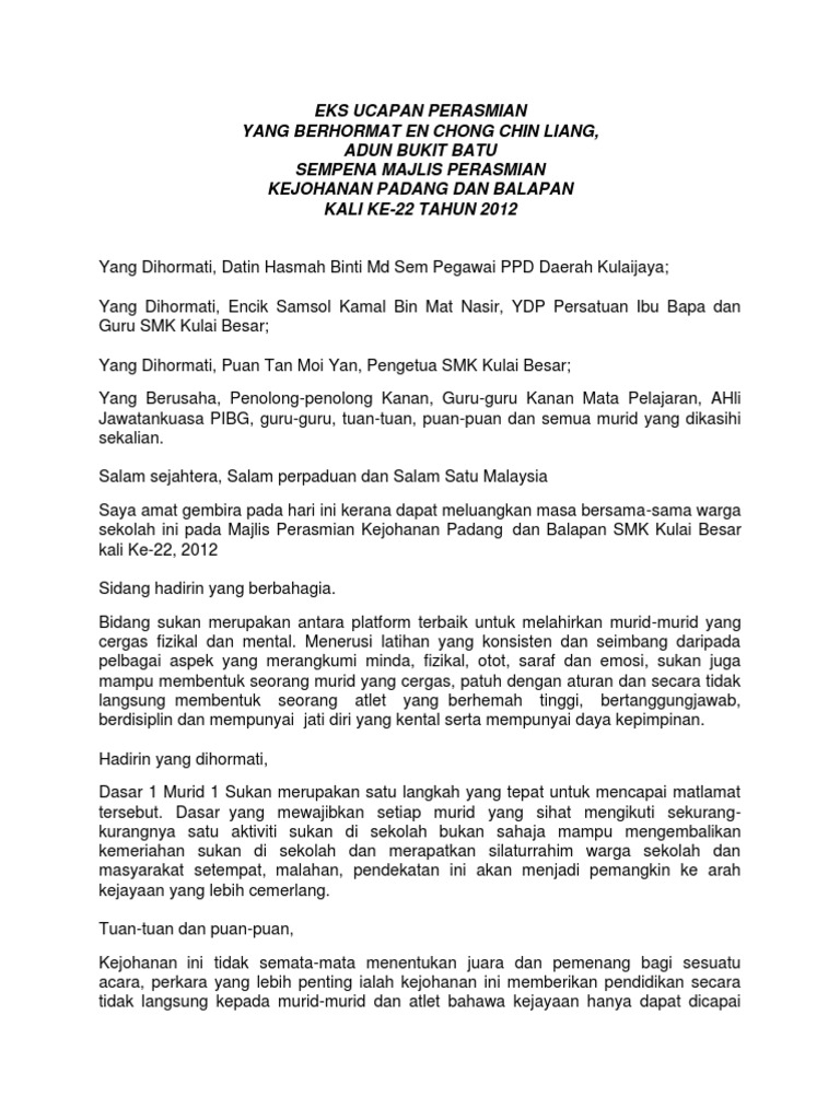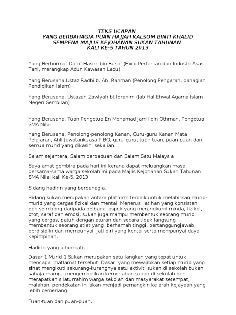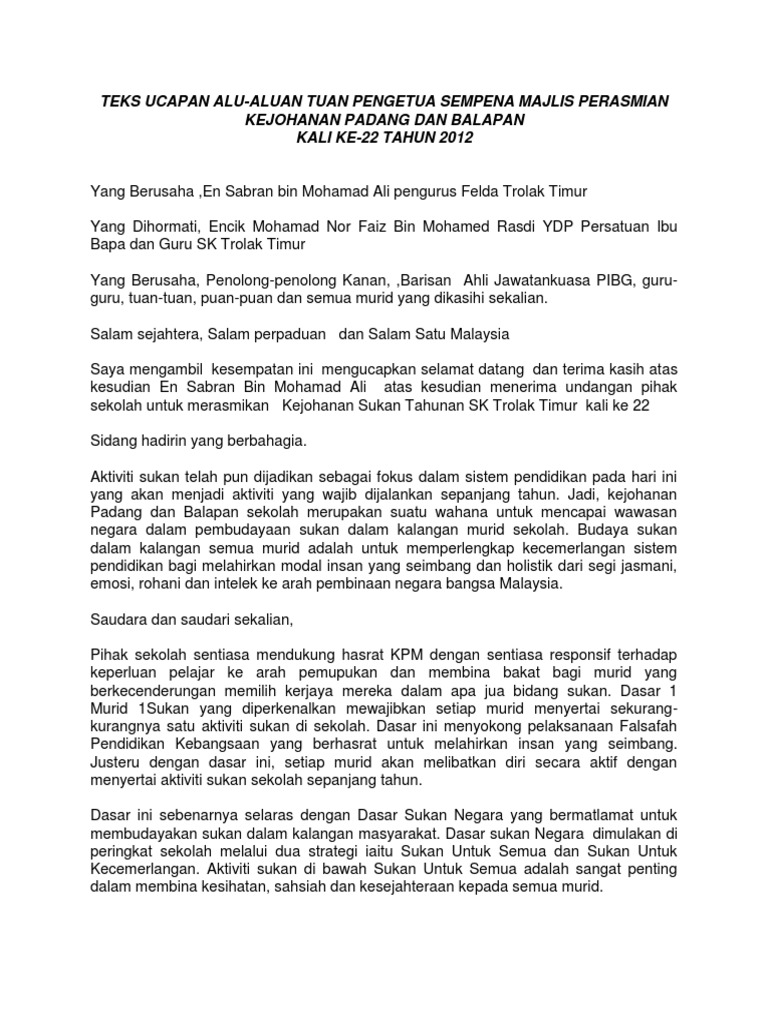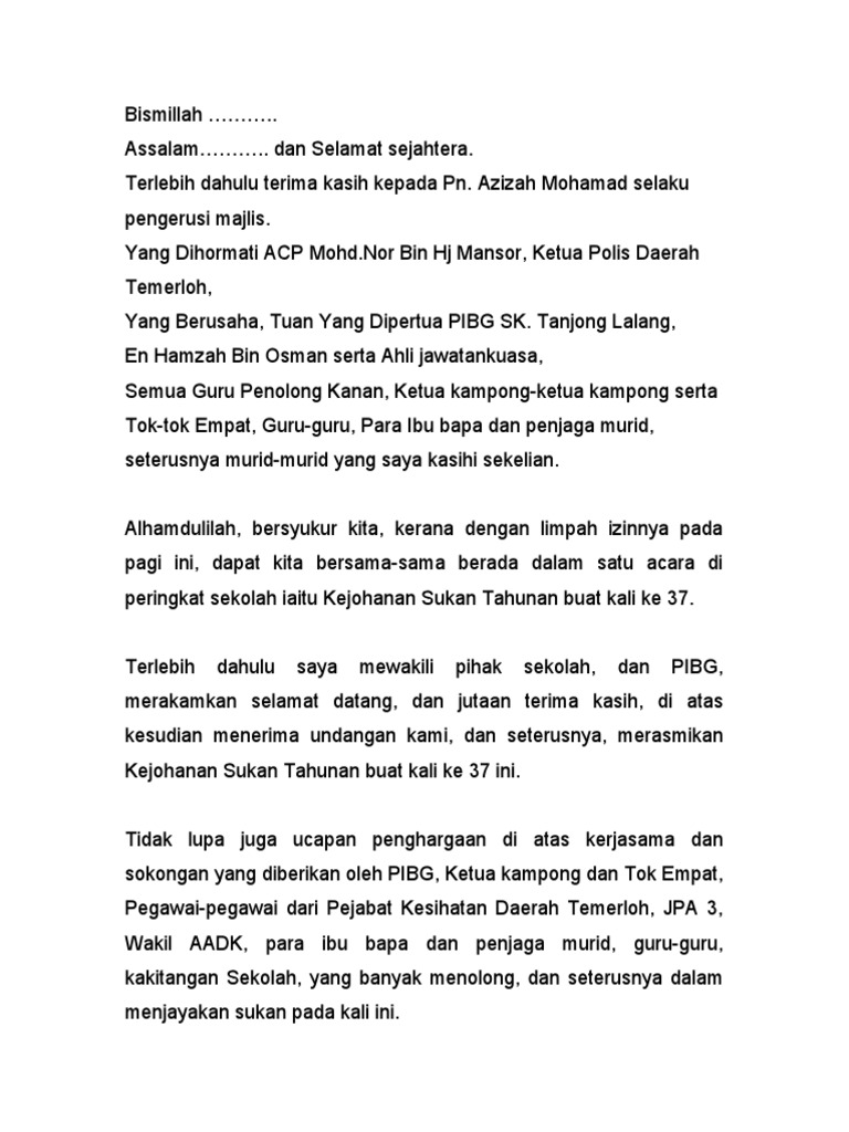 Teks ucapan perasmi hari sukan negara. Berdasarkan matlamat kurikulum standard sekolah rendah buku ini ditulis bagi membantu murid menguasai pengetahuan kemahiran dan nilai yang diperlukan murid untuk. I am deeply saddened by the loss that you and your family have encountered.